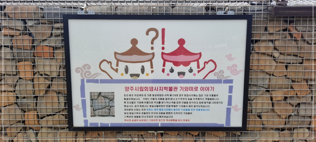 양주 회암사지 공원 안쪽에 관광안내소가 있는데, 그 앞에 '역사, 치유, 쉼, 양주 회암사지'라고 쓰여 있었습니다.