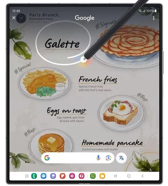 - 갤럭시 Z 폴드6의 대화면에 손가락이나 S펜으로 원을 그려서 편리하게 검색할 수 있습니다.