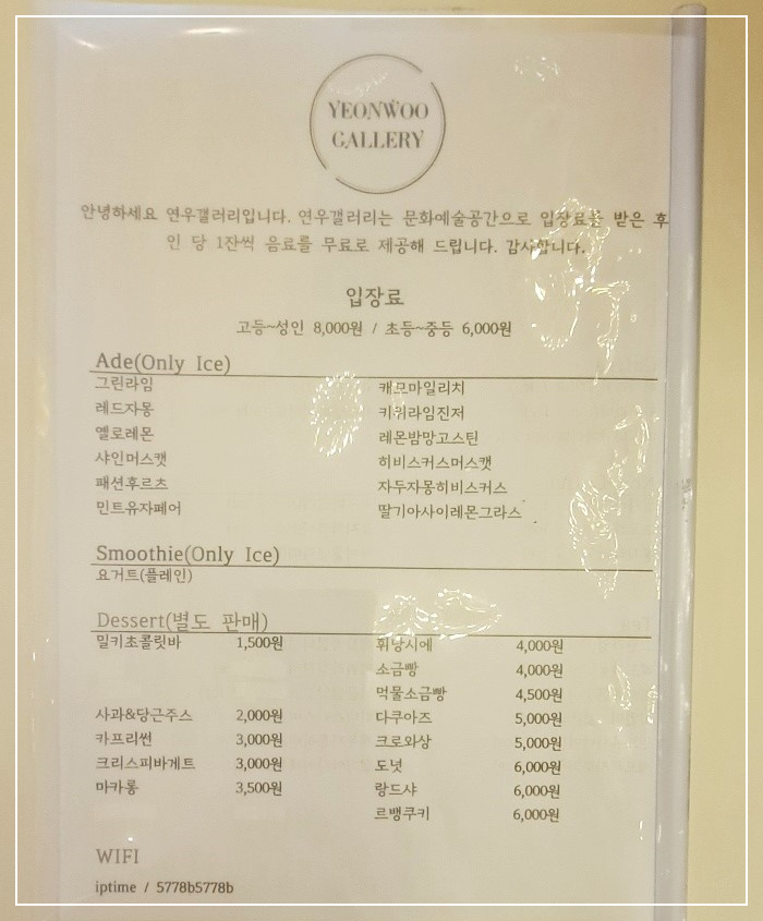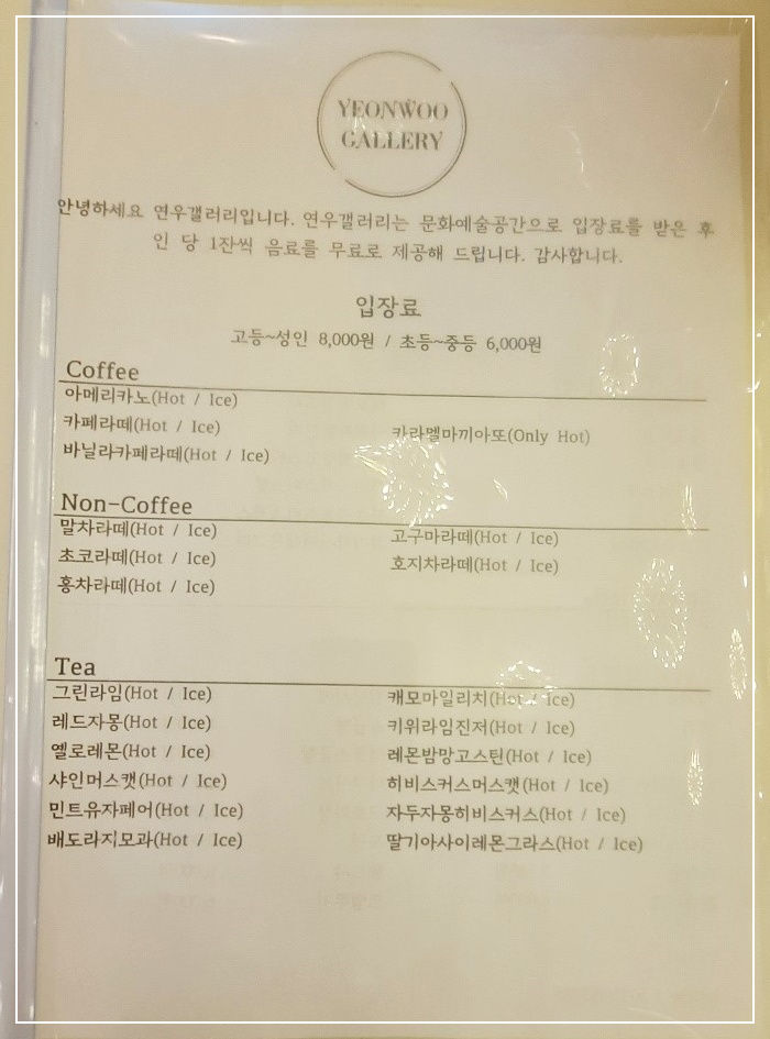 연우갤러리는 문화예술공간으로 입장료를 받은 후 인 당 1잔씩 음료를 무료로 제공합니다.