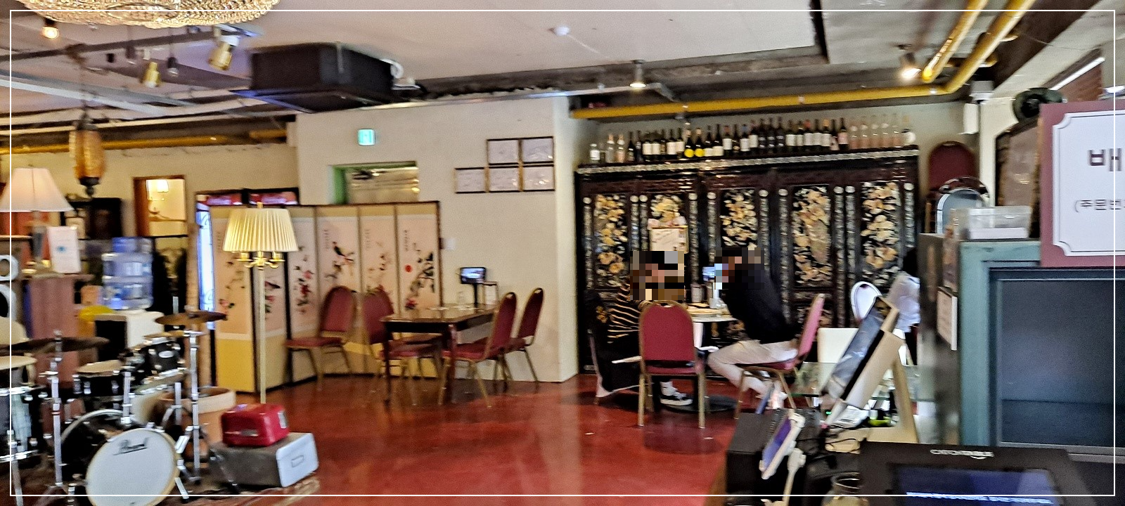 문을 열고 들어가면, 제일 먼저 가운데 라이브 공연을 하는 무대에 여러 가지 악기들이 놓여 있었습니다.